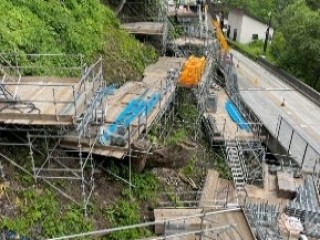 軽量ボーリングマシンを使用して落石防護ネットを施工する為の構台です。